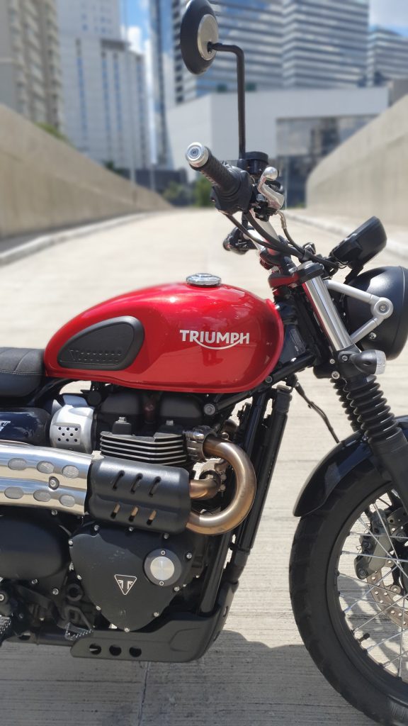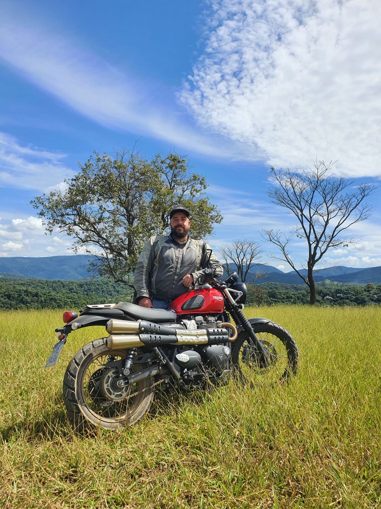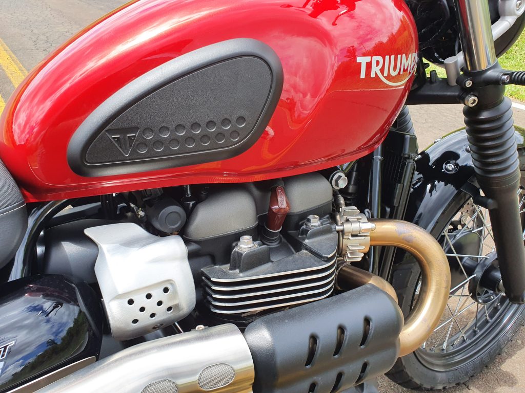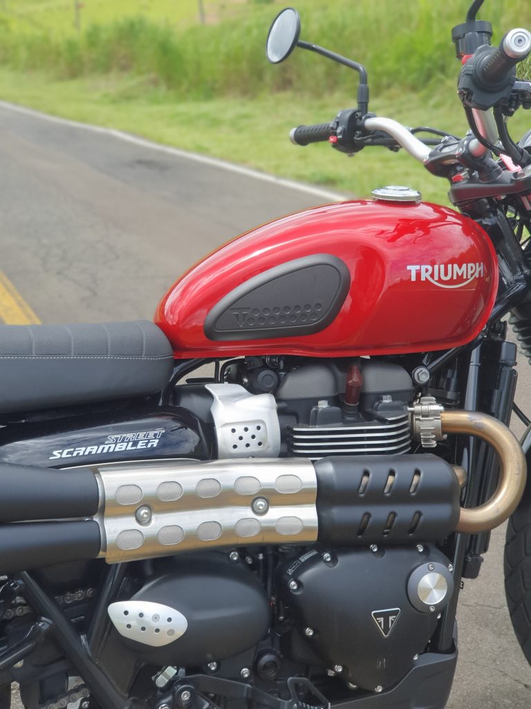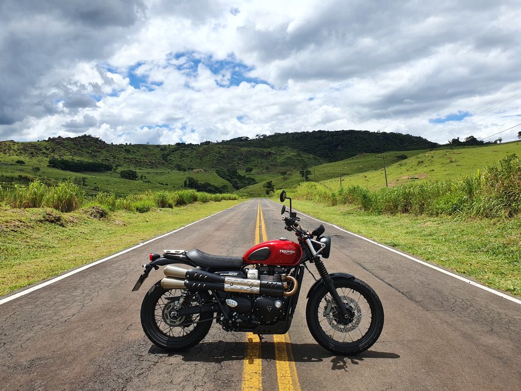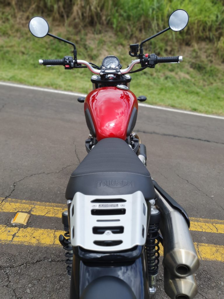 Imagine aquele pôr do sol inesquecível em uma montanha que, para se chegar até ela, seja necessário um off-road? Com essa Triumph, vá tranquilo. Essa é a vibe que eu imagino para esse clássico da montadora britânica. Como já estava na Estrada dos Romeiros, aproveitei para testá-la nas curvas. Mesmo com pneu misto, não decepcionou. Ela é ágil e o motor 900 mostra sua potência nas retomadas (65cv e 8,16 kgf.m). Da mesma forma, os freios Brembo diminuem a velocidade nas entradas de curva com eficiência. Moto aprovada tanto nas curvas como no off-road leve.