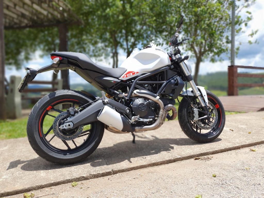Referenteà parte estética, antes de vê-la ao vivo, tinha certo receio da cor branca,pois estava acostumado com o clássico tom vermelho da Ducati. Porém, ao medeparar com a moto pela primeira vez, mudei de opinião! O branco foscorealmente é uma cor diferenciada. Vale lembrar que também está disponível aopção em vermelho para o ducatista fiel às raízes da montadora italiana.