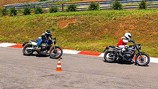A Scrambler 1220 XE tem um ângulo de inclinação de 26,9 graus, então fiquei um pouco surpreso quando raspei a pedaleira nas primeiras curvas do percurso. Aí percebi que não estava utilizando meu corpo da maneira correta. Com uma leve adaptação e usando um pouco mais meu peso, a pilotagem ficou melhor e raspei a pedaleira somente quando deitei bastante a moto nas curvas mais fechadas. Se você tem dúvida sobre esse tipo de técnica, recomendo fazer um curso de pilotagem. A própria Triumph tem cursos por meio do programa TriumphTRX. Quem acompanha meus passeios com frequência, sabe que eu me divirto nas curvas e avalio com cuidado o desempenho nos trechos sinuosos. E não só não me desapontei nesse quesito, como me diverti muito! Depois de uma volta completa no circuito, me senti bem confortável, apto para realmente testar o potencial da Scrambler 1200 XE. Felizmente, não tive que usar nenhum de seus componentes de segurança, como ABS ou controle de tração, mas utilizei ao máximo o motor 1200 Bonneville. A retomada de velocidade após as curvas mais fechadas é rápida e não vai decepcionar quem está acostumado com as motos de alta performance da montadora inglesa.