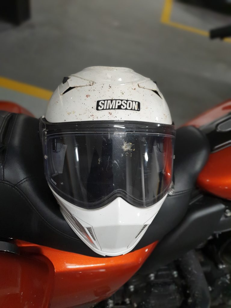 A diferença entre a Road Glide e a Street Glide é o tipo de carenagem. A primeira tem o estilo “shark nose”, que é presa no quadro, permitindo que o guidão se mova de maneira independente. Por outro lado, a segunda é fixa na frente da moto, movimentando junto com o guidão. No trânsito, a Street Glide traz mais mobilidade para desviar dos retrovisores. Já em manobras de baixa velocidade, a Road Glide facilita a agilidade e o menor esforço, já que a frente fica um pouco mais leve. Na questão de proteção, o morcegão leva uma pequena vantagem devido à menor inclinação em comparação ao shark nose, bloqueando mais o vento. Caso você queira um pouco mais de abrigo, existem algumas opções de para-brisas que vão te ajudar sem perder o estilo. Não recomendo trocar pelo modelo de fábrica que vem na Road Glide Ultra, pois irá modificar muito as linhas da versão Special. A foto abaixo, feita da altura do meu capacete, ilustra melhor o nível de proteção. Apenas o topo dele ficou sujo. O restante ficou bem protegido. Se você mede mais de que 1,70m considere que terá menos proteção ao vento.