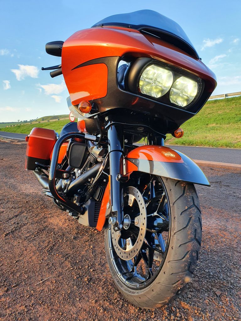 A parte estética da moto é fora de série, como já mencionei. Seu design arrojado vai chamar a atenção em qualquer lugar. A cor do modelo que pilotei foi a Scorched Orange/Silver Flux, uma mistura de laranja com cinza escuro que complementa ainda mais o estilo da moto. No total, existem seis opções de cores capazes de agradar a todos os gostos.